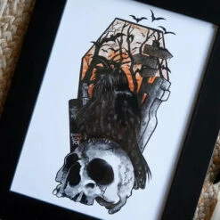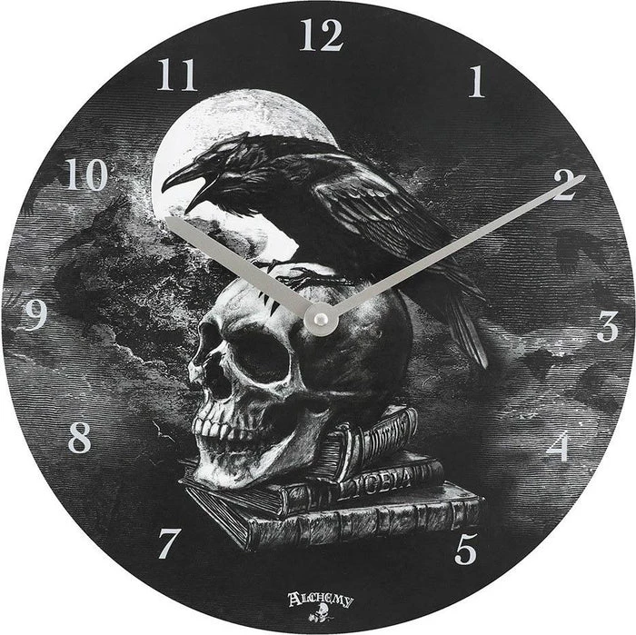 This bold clock design featuring a skull and a raven was inspired by the work of Edgar Allen Poe.