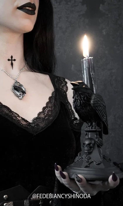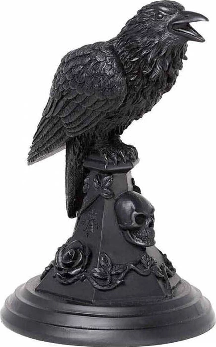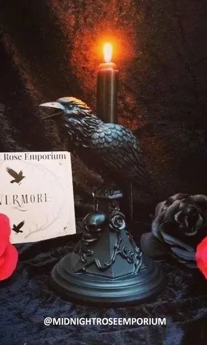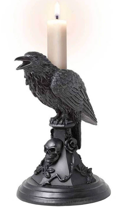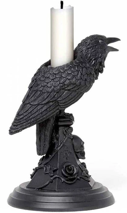 A raven, rose and skull design candle stick hand finished in the finest quality black resin.