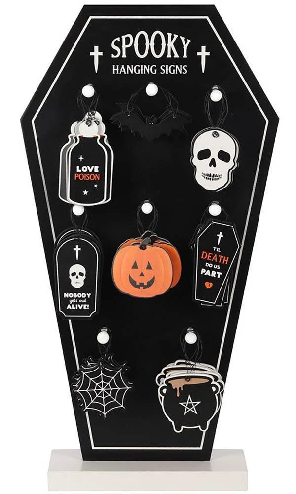 Whether for the Halloween season or year-long spooky dΓ©cor, these mini signs make great accents to any haunted home. 8 exclusive designs feature a bat, skull, pumpkin, spiderweb, love potion bottle, tombstone, coffin, and a witch’s cauldron.