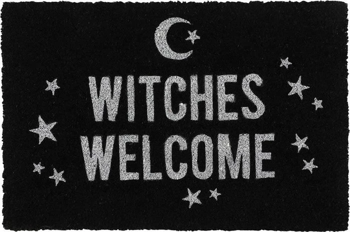 A Black coir doormat with printed ‘Witches Welcome’ text surrounded by a crescent moon and stars. Makes a fun welcome at the front door of any witch’s home.Β