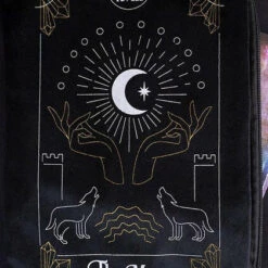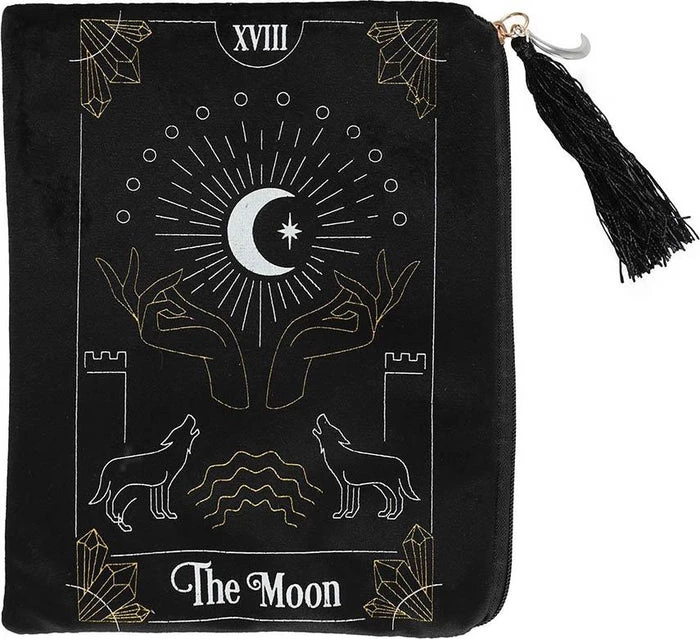 This velvet zipper pouch is the perfect place to keep tarot decks, crystals, beauty products and other treasures. Features a stunning white and gold moon tarot card illustration on the front and a matching tassel and crescent moon charm on the zipper.ย