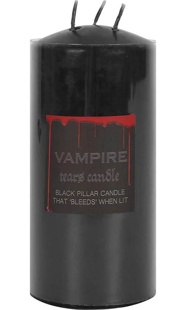 This pillar Vampire Tears candle gets its name from the bright red coloured wax which melts and drips after lighting the wicks. Made from paraffin wax the candle has three wicks for even burning and has an approx burn time of 20 hours.