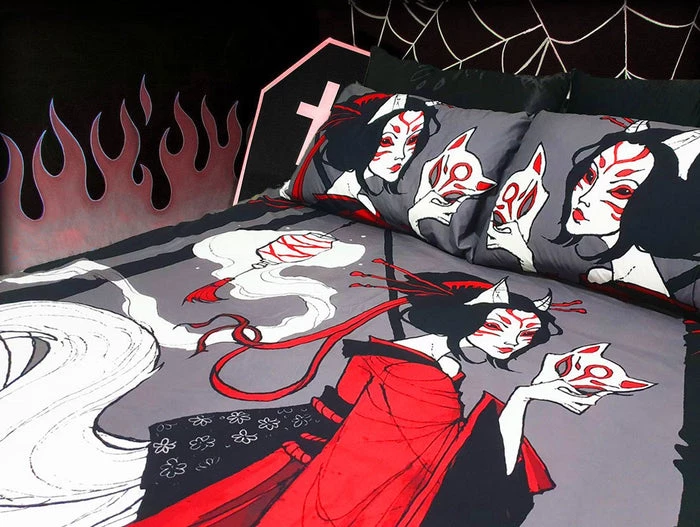 The Kitsune Horrors Quilt Set brings enchanting and macabre vibes to the bedroom. Featuring a Japanese Nine Tailed Fox design – perfect for anybody who likes to doze on the deadly side!