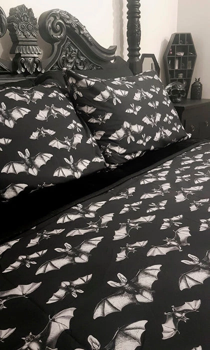 The Midnight Flight Quilt SetΒ bringsΒ spookyΒ andΒ macabreΒ vibes to the bedroom.Β FeaturingΒ an all over dark bat designΒ – perfect for anybody who likes to doze on the deadly side!Β