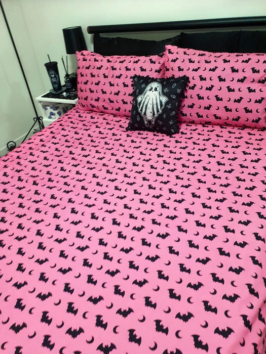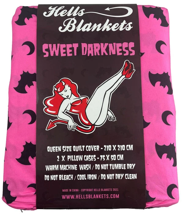 The Sweet Darkness Quilt Setย bringsย spookyย andย macabreย vibes to the bedroom.ย Featuringย an all over Bat and Crescent Moon designย – perfect for anybody who likes to doze on the deadly side!ย