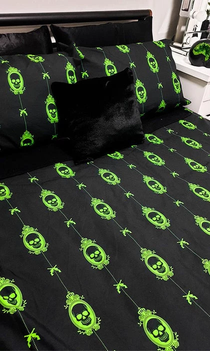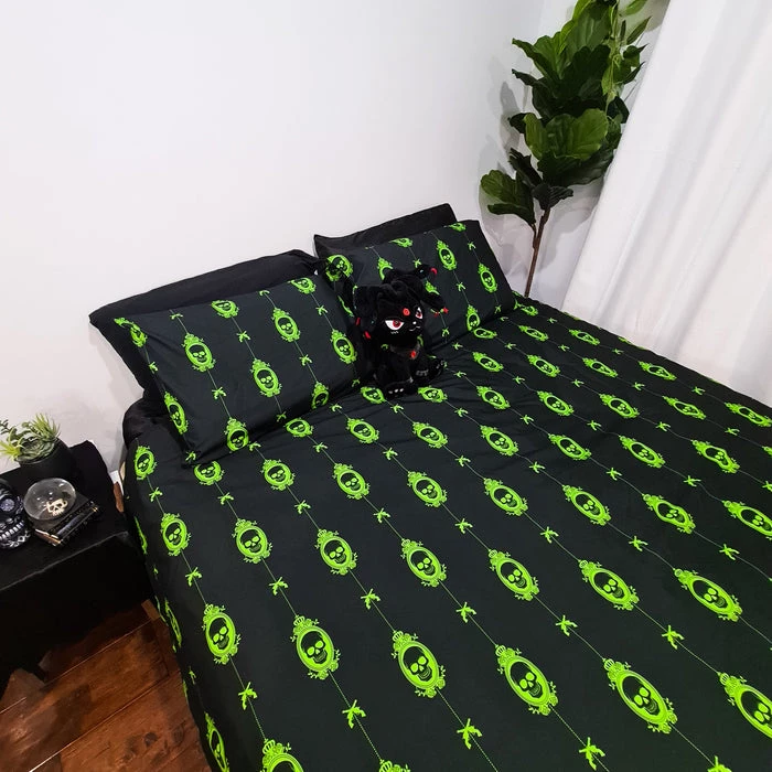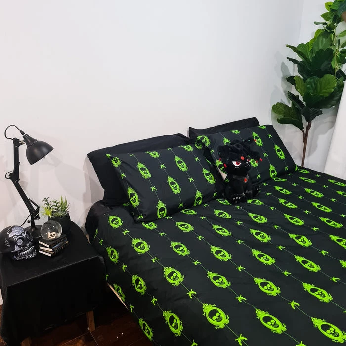 The Poison Nightmare Quilt Set brings creepy and macabre vibes to the bedroom. Featuring skulls print design – perfect for anybody who likes to doze on the deadly side!