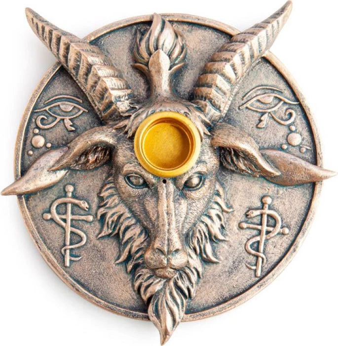 Bronze-look incense burner and candle holder that features a bold Baphomet design between the Eyes of Horus & Rod of Asclepius icons