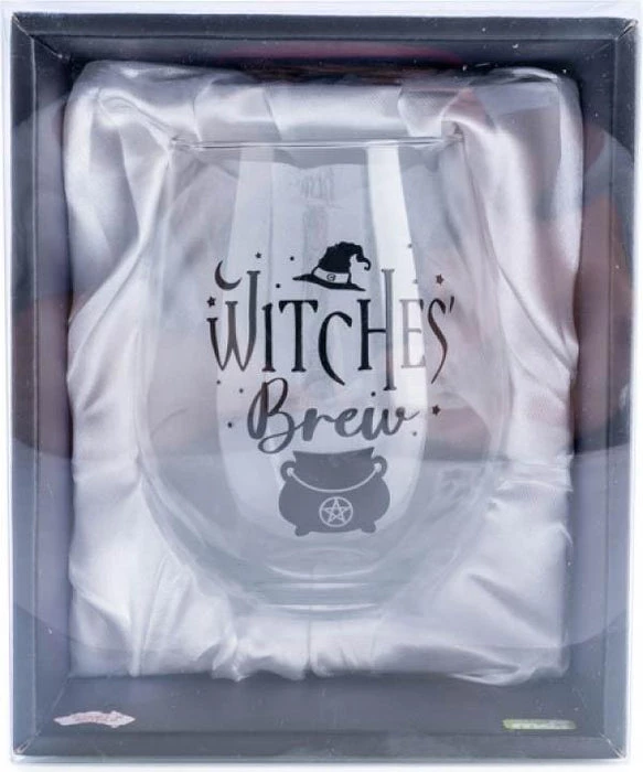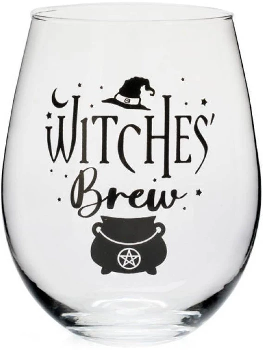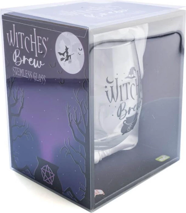 Hand-blown stemless glass featuring ‘Witches’ Brew’ decal with a pentacle cauldron and star motifs.