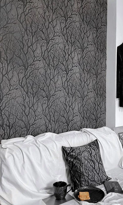 Take a walk through a dimly lit forest with this luxurious wallpaper.Β