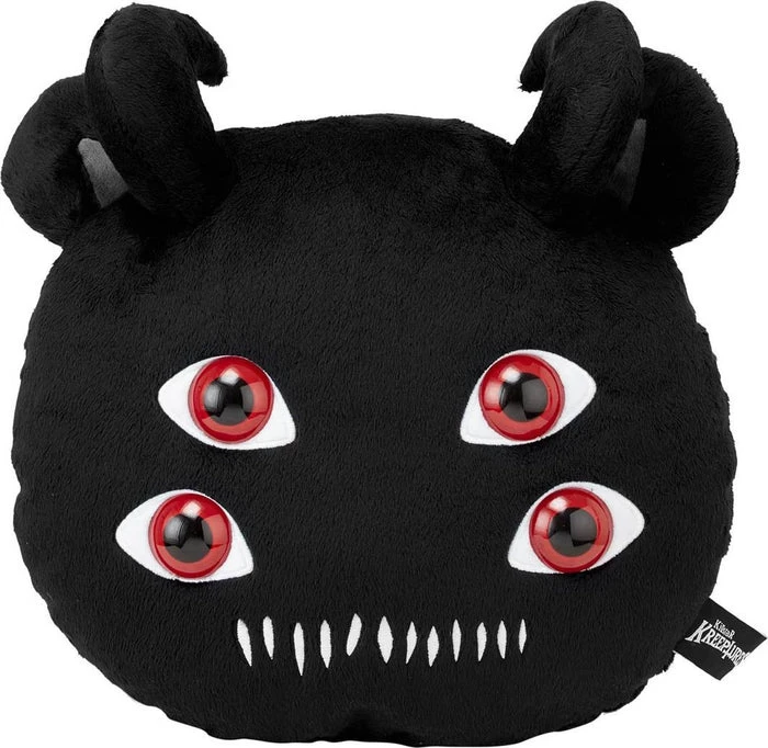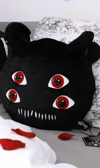 Creatures of the night – let’s party! This decorative ‘Don’t Care’ cushion will matchΒ your wardrobe and soul perfectly. Custom shape in super soft faux fleece – featuring two sets of blood-red eyes, ears, horns and an embroidered mouth.