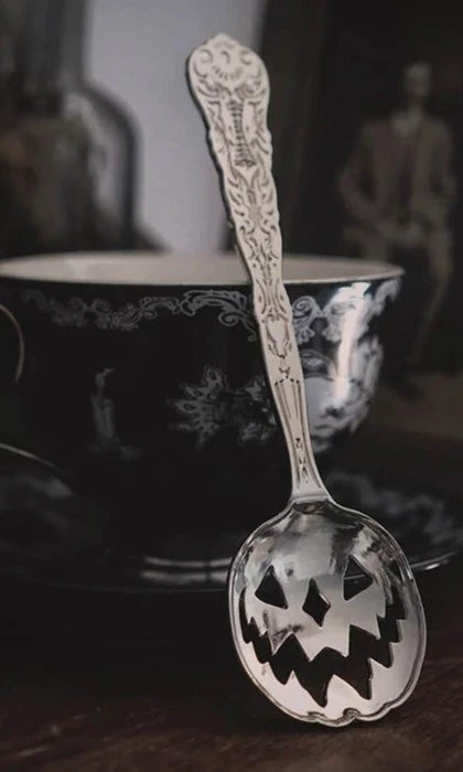 Haunted Hallows. The official Jack-O-Lantern of Lively Ghosts. This 6″ spoon features intricate design-work on the handle — including crescent moons and a Victorian-inspired filigree — as well as a cutout jack-o-lantern design for the base. Perfect for mixing libations such as tea, cocktails, poison, and the like.