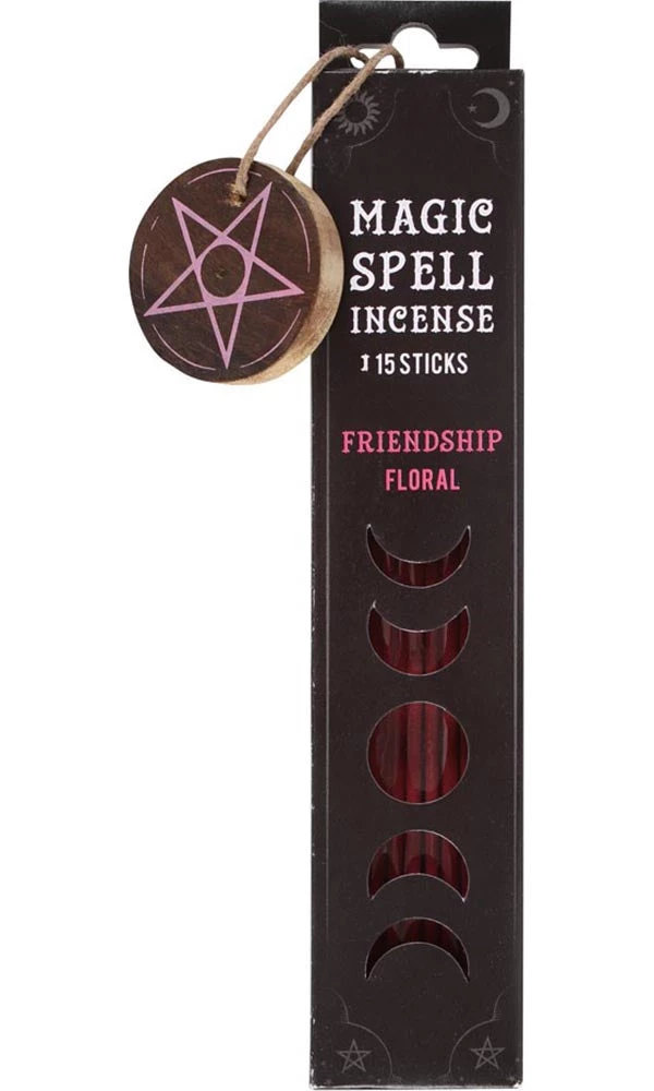 This box of magic spell incense includes 15 floral scented incense sticks and a matching wooden pentagram holder that is perfect for accompanying spells of friendship and understanding. Whether used for spell work or everyday enjoyment, this fragrance will attract all things kind and nurturing.