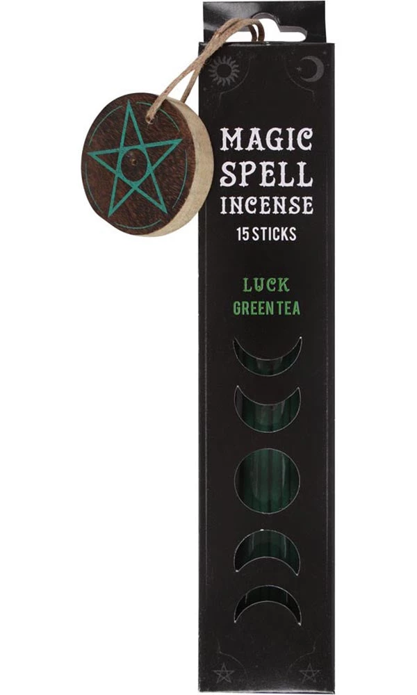 ο»ΏThis box of magic spell incense includes 15 green tea scented incense sticks and a matching wooden pentagram holder that is perfect for accompanying spells of good fortune. Whether used for spell workΒ or everyday enjoyment, this fragrance will attract all things lucky.