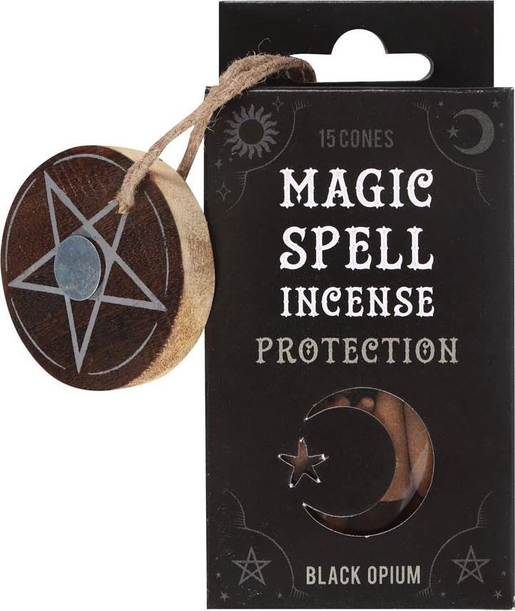This box of magic spell incense includes 15 opium scented incense cones and a matching wooden pentagram holder that is perfect for accompanying spells of protection and guidance. Whether used for spell work or everyday enjoyment, this fragrance will attract all things divine.