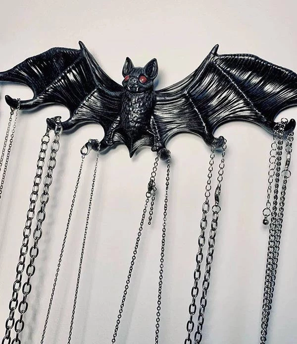 This vampiric wall plaque would make the perfect addition to any Gothic home. A large Vampire Bat has his wings spread wide, as if gliding through the sky. His piercing eyes are red in colour, which adds to his dark charms. Each tip of the wings form the small hangers and can be used to hang keys or jewellery, the options are endless.