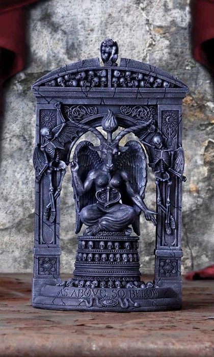This mystical figurine is cast in the highest quality resin before being carefully hand-painted. Resting on a pillar made up of bones and skulls, the Baphomet can be seen sitting cross-legged with their arm raised in a magical blessing with the world SOLVE written on their forearm, while their left arm is stretched downwards and outwards invitingly, bearing the word COACULA. Surrounded by a wall of skeletons all whilst being kept guard by a grotesque, this incredibly detailed piece is a must-have addition to any alternativeย home or gothic collection.