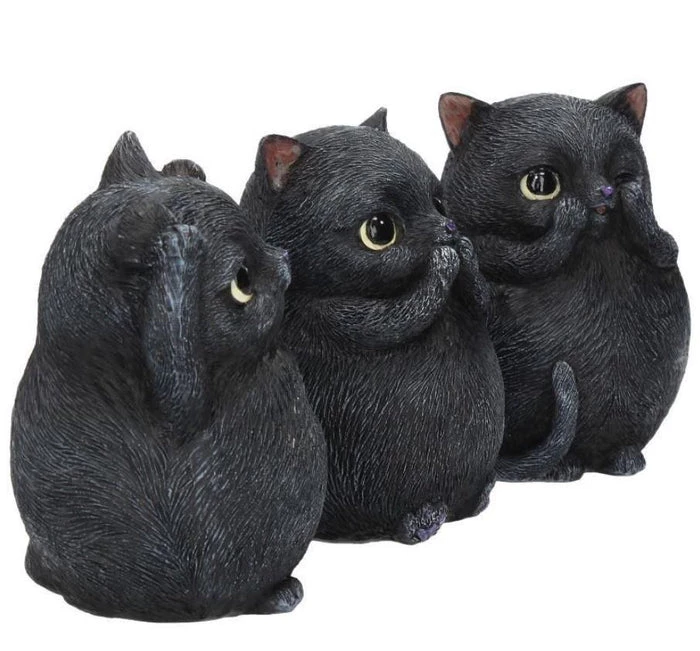 Sitting side by side, these three wise kitties look up with adorable eyes with purple heart-shaped noses. One clasps their paws to their mouth, one blocks their ears, and one covers their eyes, sneaking a peek regardless. Cast in the finest resin before being lovingly hand-painted, these adorable animals are the perfect illustration of Confuciusβ famous maxim: βSee no evil, hear no evil, speak no evilβ