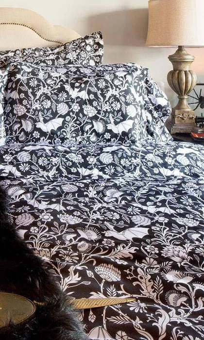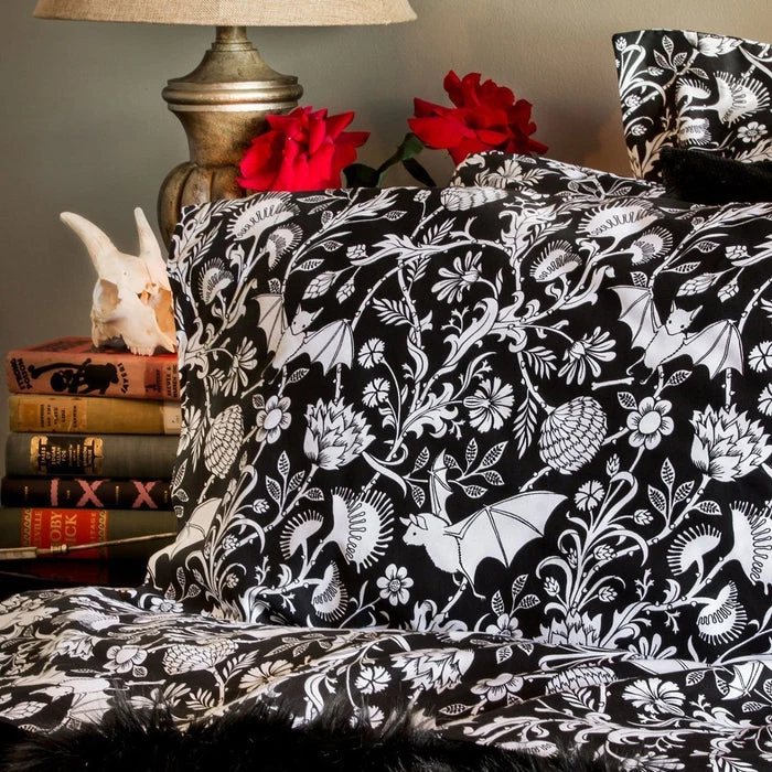 Step into a garden of delight. The Elysian Fields bring bats and botanicals home for you to enjoy. Let the eye wander among non-traditional foliage like Venus Fly Traps and Thistles. Your bat cave deserves the best linens and we’ve got you covered with this bats and botanical print for the home.