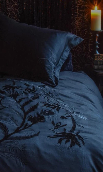 It takes over 500 stitches to create this dark black on black botanical dreamscape. The Black Widow Duvet Cover reveals a midnight scene evocative of the woods from which inspiration comes. A spider web center is circled by insects, a spider, deaths head moth and foliage embroidered in black on soft black cotton duvet cover.