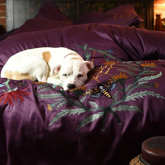 On a deep eggplant-hued base, the Forest Witch Duvet Cover revealsΒ a botanical scene with a golden thread spider web,Β spider, death moth, bugs and foliage. It takes over 500 stitches to create this scene with luscious gem-tonesΒ evocative of the woods from which this inspiration comes. CoordinatingΒ Shams have spider webs creeping from the corners, as they do…Β