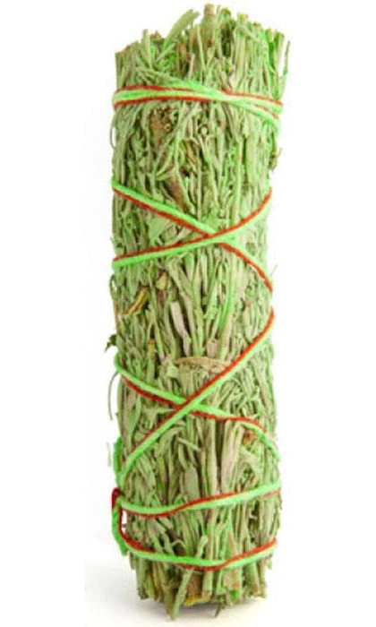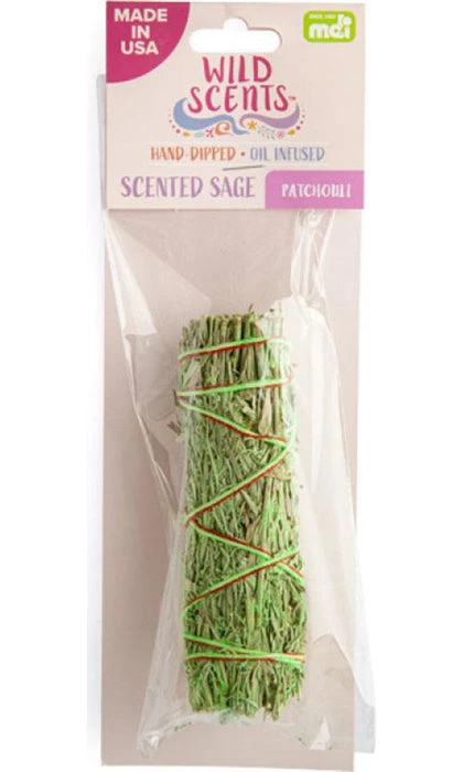 Hand-bound scented cleansing stick made of blue sage leaves and stems, infused with patchouli oil